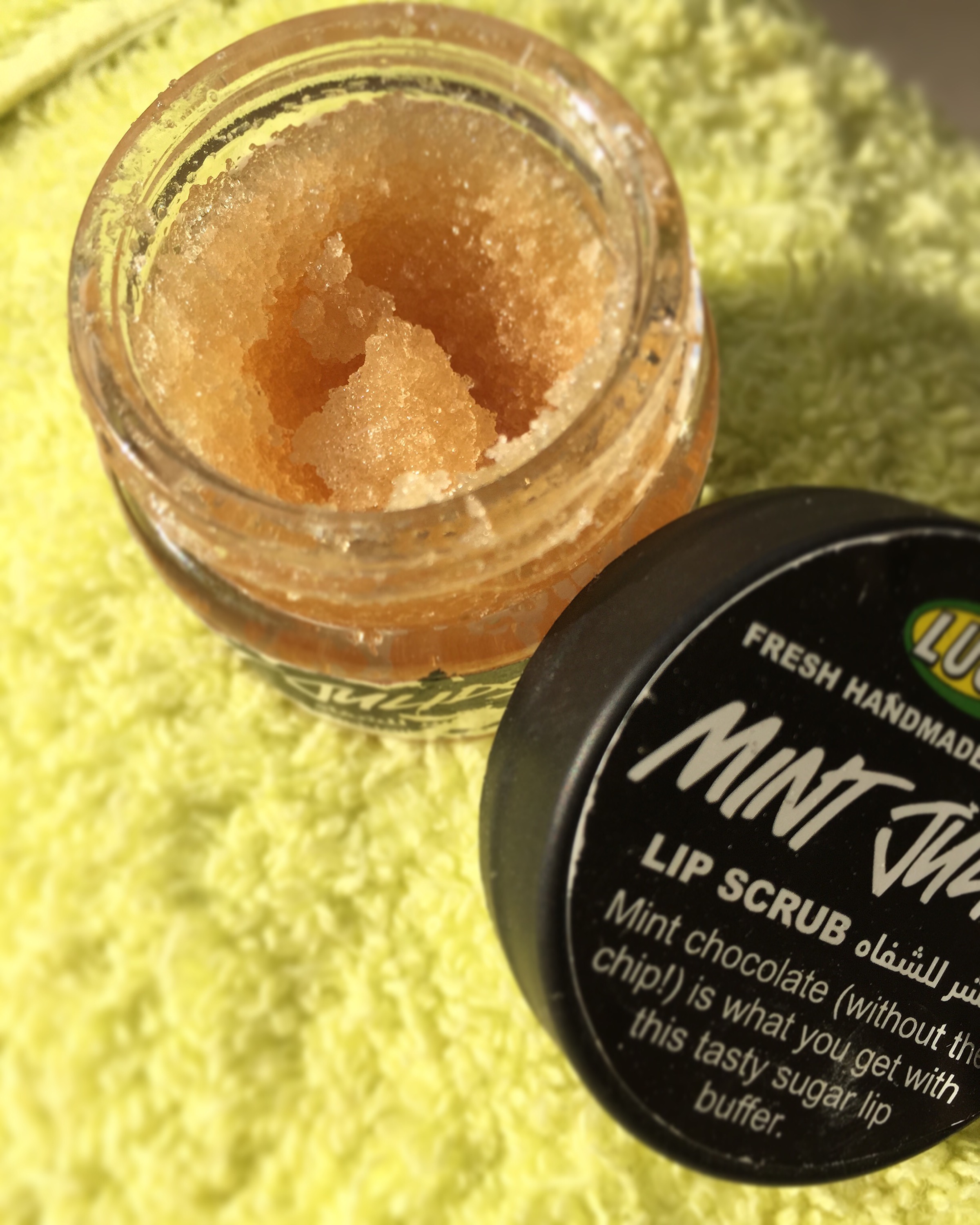 The Lush Mint Julips Lip Scrub comes in a small jar and smells delicious. The scent is minty & the flavor is chocolate mint, which you will feel like eating while scrubbing your lips by the way!